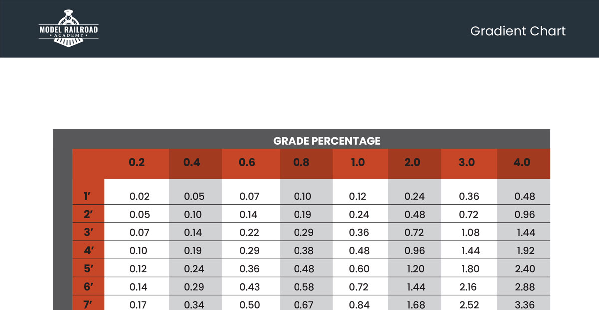 This chart will help you figure your gradients as you build your layout, remembering that a 2% grade is steep for a main line railroad and 4% is steep for narrow gauge, branch line, or industrial railroad. Model trains need pretty much the same gradients as real trains. This is a handy chart!
